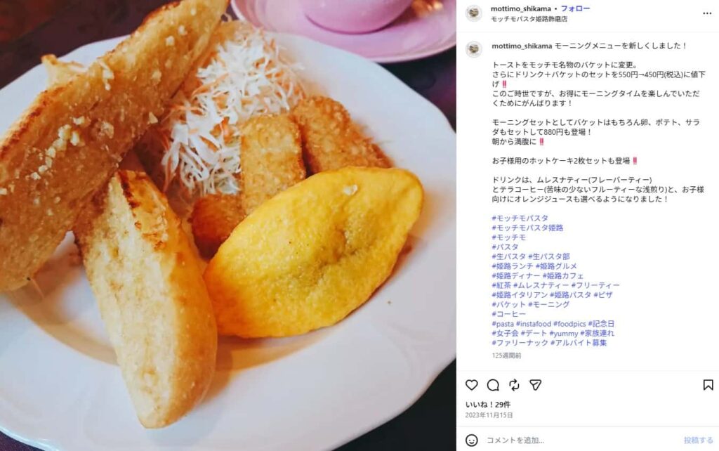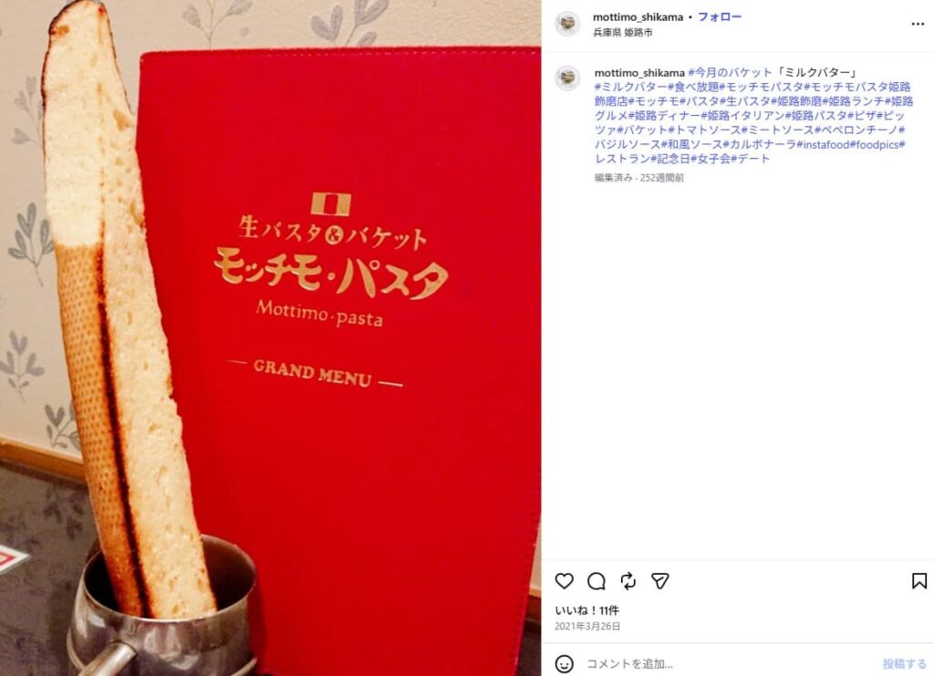 口コミによると「バケットがふわふわでパスタはモチモチでおいしい」という声が上がっていました。