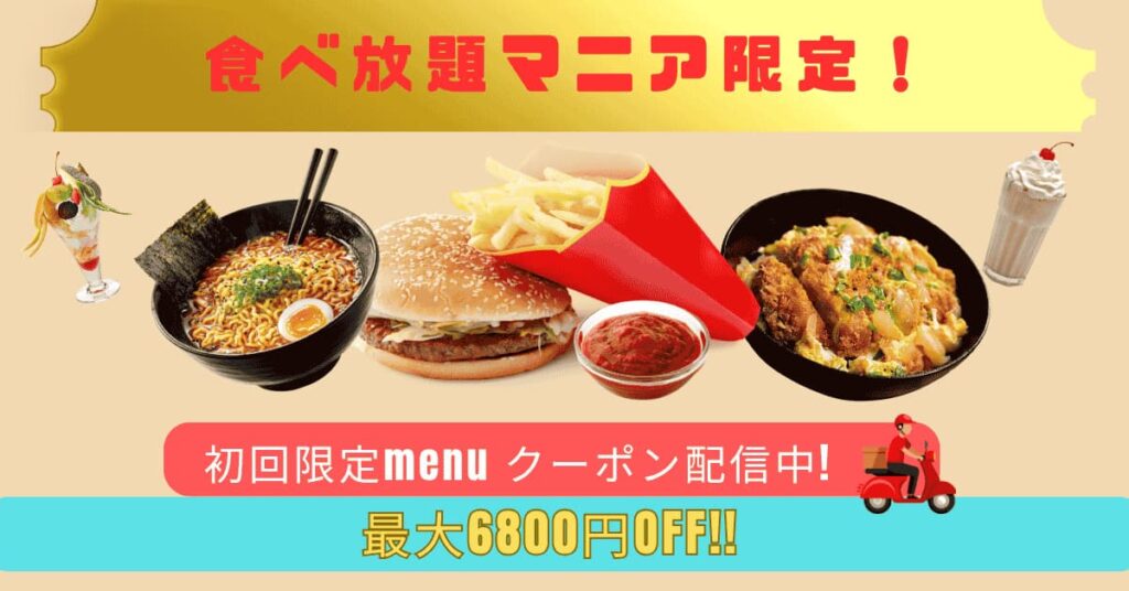 今回食べ放題マニア限定で、読者の皆様へmenuの初回限定6800円分のクーポンを配信しています!